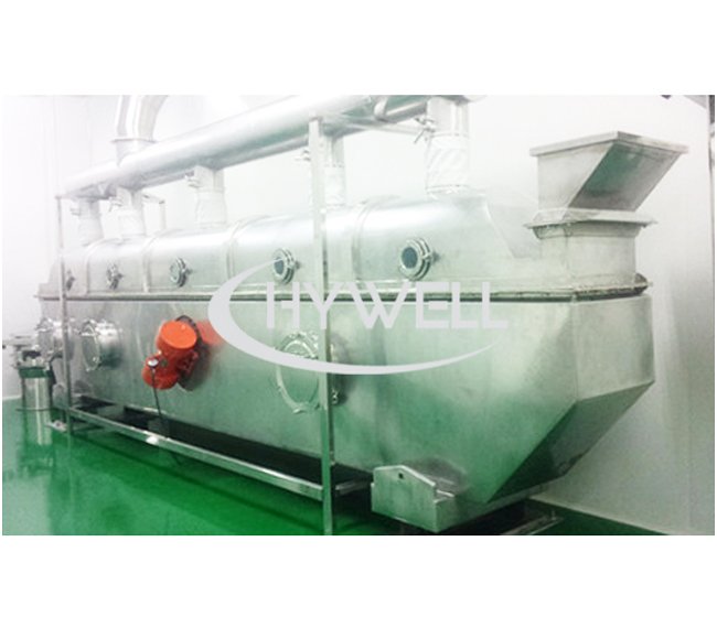 物料自进料口进入机内,在振动电机或其他方式提供的激振力作用下,在空气分布板上跳跃前进,同时空气经过滤后,被加热到一定温度,由风口进入干燥机下风室中,物料在振动力和经空气分布板均风的热气流双重作用下,呈悬浮状态与热气流接触,物料颗粒与热介质之间进行着激烈的湍动,使传热和传质过程得以强化,干燥后的产品由排料口排出,蒸发出的水份和废气经旋风分离器回收粉尘后,排入大气。